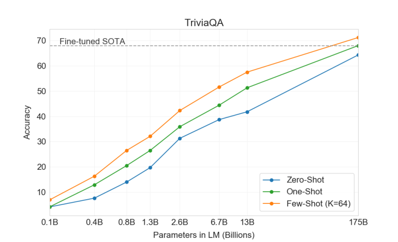 总的来说,在 NLP 任务上,GPT-3 在零样本和单样本设置中取得了有希望的结果,并且在少样本设置中,有时与最先进的微调模型竞争,甚至偶尔超过它们(尽管最先进水平是由微调模型保持的)。例如,GPT-3 在零样本设置下在 CoQA 上达到 81.5 F1,在单样本设置下在 CoQA 上达到 84.0 F1,在少样本设置下达到 85.0 F1。同样,GPT-3 在零样本设置下在 TriviaQA 上达到 64.3% 的准确率,在单样本设置下达到 68.0%,在少样本设置下达到 71.2%,后者相对于在相同闭卷设置下运行的微调模型而言是目前最先进的。