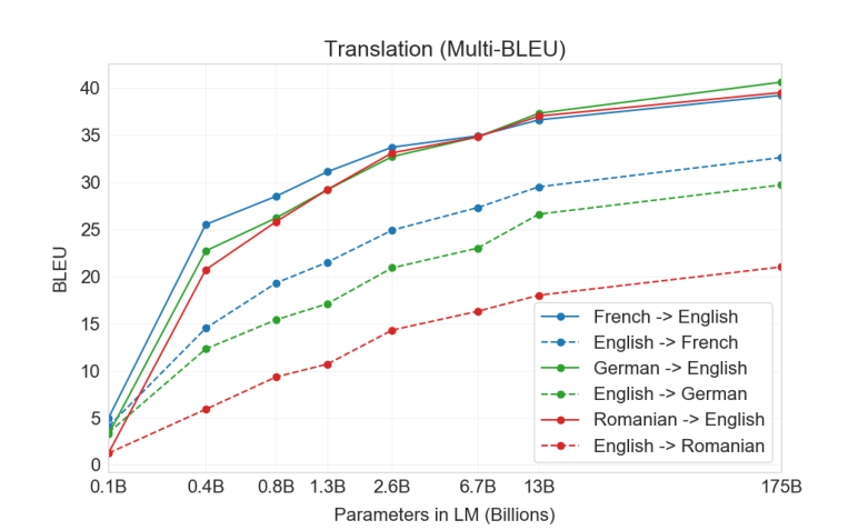 语言建模的另一个近期趋势可能提供了一条前进的道路。近年来,Transformer 语言模型的容量大幅增加,从 1 亿参数 [RNSS18],到 3 亿参数 [DCLT18],到 15 亿参数 [RWC+19],到 80 亿参数 [SPP+19],110 亿参数 [RSR+19],最后到 170 亿参数 [Tur20]。每一次增加都带来了文本合成和/或下游 NLP 任务的改进,并且有证据表明,与许多下游任务相关良好的对数损失(log loss),随着规模的扩大遵循平滑的改进趋势 [KMH+20]。由于上下文学习涉及在模型参数内吸收许多技能和任务,因此上下文学习能力随着规模的扩大而显示出同样强大的收益是合理的。