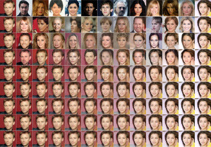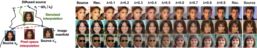 粗到细插值 图 9 显示了当我们改变潜空间插值之前的扩散步数时,一对源 CelebA 图像之间的插值。增加扩散步数会破坏源图像中的更多结构,模型在反向过程中完成这些结构。这允许我们在精细粒度和粗糙粒度上进行插值。在 0 扩散步的极限情况下,插值在像素空间中混合源图像。另一方面,在 1000 扩散步后,源信息丢失,插值成为新样本。