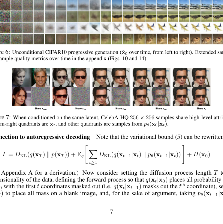 我们使用扩散模型展示了高质量的图像样本,并发现了扩散模型与用于训练马尔可夫链的变分推理、去噪得分匹配和退火 Langevin 动力学(以及扩展后的基于能量的模型)、自回归模型和渐进式有损压缩之间的联系。由于扩散模型似乎对图像数据具有极好的归纳偏置,我们期待研究它们在其他数据模态中的效用,以及作为其他类型生成模型和机器学习系统组件的潜力。