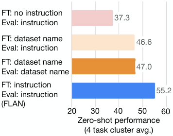 在最后的消融研究中,我们探索了微调期间指令的作用,因为一种可能性是性能增益完全来自多任务微调,而模型在没有指令的情况下也能表现得同样好。因此,我们考虑了两种没有指令的微调设置。在“无模板”设置中,仅向模型提供输入和输出(例如,对于翻译,输入将是“The dog runs.”,输出将是“Le chien court.”)。在“数据集名称”设置中,每个输入都预置了任务和数据集的名称(例如,对于翻译成法语,输入将是“[Translation: WMT’14 to French] The dog runs.”)。