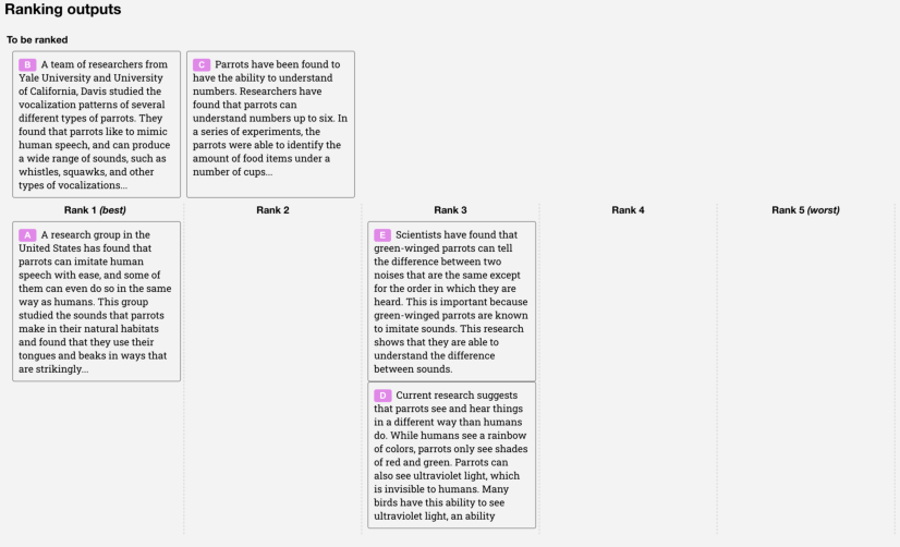 最终的奖励模型是从一个 6B GPT-3 模型初始化的,该模型在各种公共 NLP 数据集(ARC, BoolQ, CoQA, DROP, MultiNLI, OpenBookQA, QuAC, RACE 和 Winogrande)上进行了微调。这主要是出于历史原因;我们发现从 GPT-3 或 SFT 模型初始化 RM 时结果相似。我们在完整的奖励模型训练集(见表 6)上训练了一个 epoch,学习率为 ,采用余弦学习率调度(在训练结束时降至其初始值的 10%),批大小为 64。训练似乎对学习率或调度不太敏感;学习率变化高达 50% 导致性能相似。训练对 epoch 的数量非常敏感:多个 epoch 会迅速导致模型在训练数据上过拟合,验证损失明显恶化。此处的批大小代表每个批次的唯一提示词数量。每个提示词有 到 个标注的补全,从中最多有 个可能的比较。平局被剔除。因此,单个批次最多可包含 个比较。