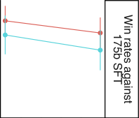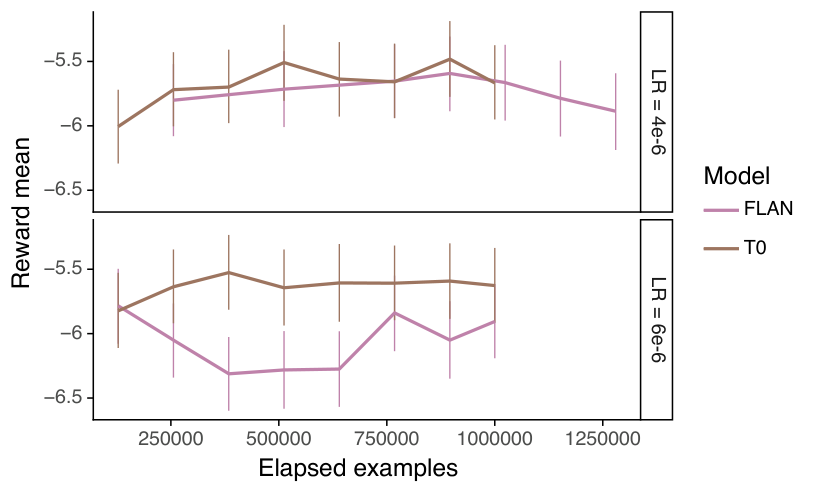我们进行了两个类似的实验来寻找最佳 T0 检查点。在一个实验中,我们使用了 128 的批大小、4e-6 的学习率和 128 万个示例。另一个实验使用了 64 的批大小、6e-6 的学习率和 100 万个示例。再次使用奖励模型分数,我们选择了来自前一个实验在 896k 个训练示例后的检查点。