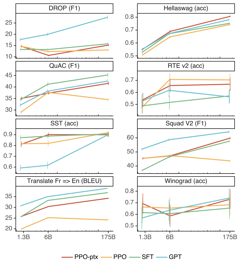 - 我们可以通过修改 RLHF 微调程序来最小化公共 NLP 数据集上的性能回归。 在 RLHF 微调期间,我们观察到在某些公共 NLP 数据集上,性能相比 GPT-3 有所下降,特别是 SQuAD(Rajpurkar 等人,2018)、DROP(Dua 等人,2019)、HellaSwag(Zellers 等人,2019)以及 WMT 2015 法语到英语翻译(Bojar 等人,2015)。这是一个“对齐税”(alignment tax)的例子,因为我们的对齐程序是以牺牲某些我们可能关心的任务性能为代价的。我们可以通过将 PPO 更新与增加预训练分布对数似然的更新(PPO-ptx)混合,在不损害标注员偏好得分的情况下,大幅减少这些数据集上的性能回归。