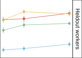 为了衡量我们的程序对训练标注员的过拟合程度,我们进行了一项实验,其中我们在标注员子集上训练多个 RM,并测试它们对留存标注员的泛化能力。我们将比较数据拆分为五组标注员,使每组具有大致相同的训练数据量。然后,我们应用五折交叉验证,通过在四组上训练 6B 奖励模型并在另一组上进行验证。我们使用附录 C.2 中定义的相同超参数。我们发现预测人类偏好输出的组间和组内验证准确率分别为 72.4±0.4% 和 69.6±0.9%,这表明我们的 RM 可以很好地泛化到从与训练集相同集合中抽取的留存标注员。
