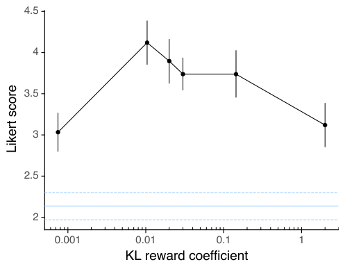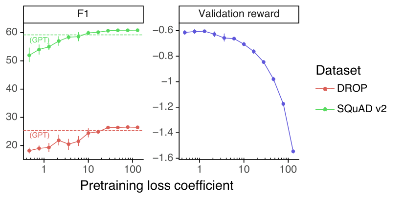 我们比较了使用不同数量的预训练数据,同时保持预训练损失系数不变。通过增加预训练数据的数量,预训练的梯度估计质量得到提高。我们发现,使用 4 的预训练数据比率,预训练分布上的对数概率损失通常会在训练过程中增加。一些初步实验表明,使用 32 的预训练数据比率可以获得更好的人类 Likert 评分。然而,训练时间也增加了几倍。通过将预训练数据比率设置为 8,训练时间是相应不使用预训练混合实验的两倍;我们将其选为训练速度和预训练损失性能之间的折中方案。