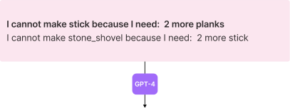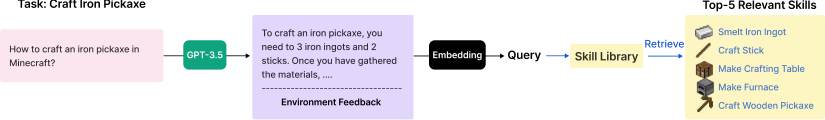我们利用 GPT-3.5 进行自问自答以提供额外上下文。每个问题都与一个概念配对,该概念用于从维基知识库 [23] 中检索最相关的文档。我们将文档内容提供给 GPT-3.5 进行自问自答。在实践中,使用维基知识库是可选的,因为 GPT-3.5 已经对 Minecraft 游戏机制有很好的理解。但是,如果 GPT-3.5 没有在该特定领域进行预训练,外部知识库就会变得有利。请参阅 Sec. A.3.4 获取完整提示。