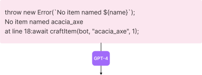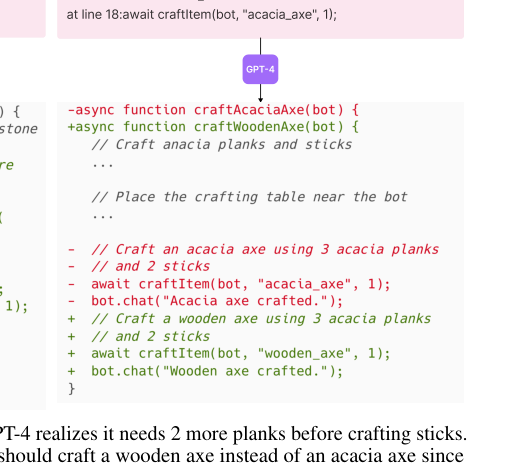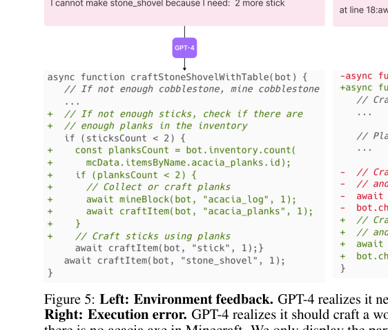 (1) 环境反馈,说明程序执行的中间进度(图 5,左)。例如,“我无法制作铁胸甲,因为我需要:7 个更多的铁锭”突出了制作铁胸甲失败的原因。我们在控制原始 API 中使用 bot.chat() 来生成环境反馈,并提示 GPT-4 在代码生成期间也使用此函数;