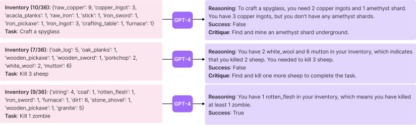 - 位置 (Position):智能体在 Minecraft 世界中的 3D 坐标 ; (3) 之前完成和失败的任务; (4) 额外上下文:请参阅 Sec. A.3.2; (5) 思维链提示 [46] 作为响应:我们要求 GPT-4 首先推理当前进度,然后建议下一个任务。