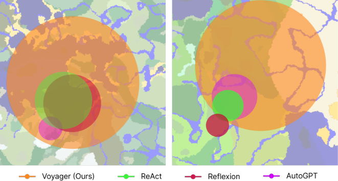 广泛的地图遍历。 VOYAGER 通过穿越各种地形,能够导航比基线长 的距离,而基线智能体通常发现自己局限于局部区域,这严重阻碍了它们发现新知识的能力(图 7)。