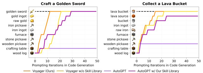 对未见任务的零样本泛化结果在图 A.3 中呈现。与图 8 类似,VOYAGER 持续解决了所有任务,而基线无法在 50 次提示迭代内解决任何任务。我们的技能库由终身学习构建,不仅增强了 VOYAGER 的性能,还为 AutoGPT [28] 提供了提升。