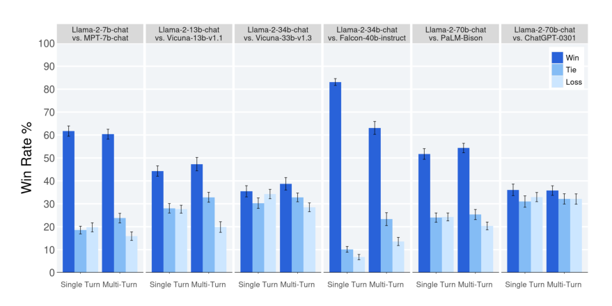 安全性人类评估。我们收集了大约 2,000 个对抗性提示用于人类评估,根据 4.2.1 节中的安全类别,其中 1,351 个提示是单轮的,623 个是多轮的。评估提示和响应的示例可以在附录 A.4.6 中找到。