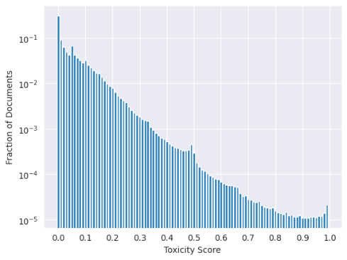 数据毒性。我们使用在 ToxiGen 数据集 (Hartvigsen et al., 2022) 上微调的 HateBERT 分类器,测量了预训练语料库英语部分中毒性的普遍性。我们分别对文档的每一行进行评分,并取平均值以分配文档分数。图 13 显示了完整语料库 10% 随机样本中的分数分布。评估的文档中约有 0.2% 被分配了 0.5 或更高的可能性分数,这意味着我们的预训练数据中存在少量毒性。