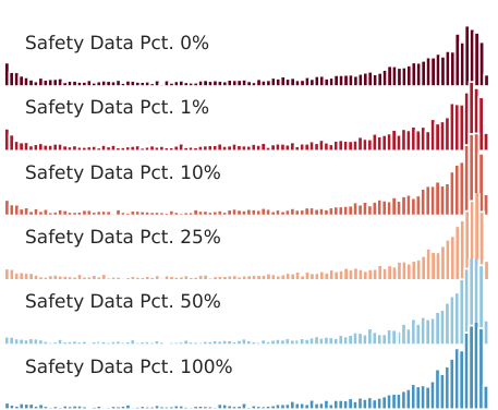 我们最终获得了 6 个模型变体,分别使用 0%、1%、10%、25%、50% 和 100% 的总安全性数据进行训练。我们使用第 3.2.2 节中描述的安全性和有用性奖励模型对它们进行评估。对于每个变体,我们使用安全性和有用性奖励模型分别对 Meta 安全性和有用性测试集中的提示对应的模型生成结果进行评分。