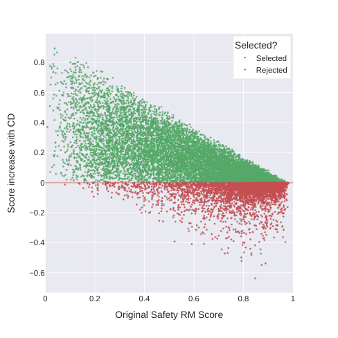使用安全性奖励模型拒绝上下文蒸馏错误。重要的是要注意,对有用提示执行安全性上下文蒸馏可能会降低模型性能并导致更多的虚假拒绝(见附录表 40)。因此,我们仅在对抗性提示上执行安全性上下文蒸馏。然而,我们观察到,即使在处理对抗性提示时,上下文蒸馏有时也会降低响应质量。具体来说,如果模型响应已经是高质量的,应用上下文蒸馏可能会导致不太相关的回复,因为模型倾向于过度强调预提示,通常过度诉诸于通用担忧(见附录表 40,了解由于上下文蒸馏导致的模糊答案示例)。因此,我们利用安全性奖励模型来决定是否使用安全性上下文蒸馏——我们仅在示例获得比原始答案更好的奖励模型分数时才保留上下文蒸馏的输出。我们注意到,这在模型非常不擅长的提示上特别有用,但限制了上下文蒸馏的负面影响(见图 16b)。