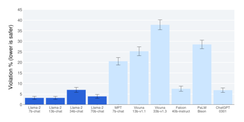 我们认为 1 或 2 的评级为违规,并使用违规百分比作为我们的主要评估指标,以平均评级作为补充。每个示例由三名标注员标注,我们采用多数投票来确定响应是否违规。我们使用 Gwet 的 AC1/2 统计量 (Gwet, 2008, 2014) 来衡量评分者间可靠性 (IRR),正如在有用性人类评估中所做的那样。IRR 分数在 0.70 到 0.95 之间变化,具体取决于标注批次,表明标注员在安全性评估上具有高度一致性。在 Llama 2-Chat 标注上,根据 Gwet 的 AC2 指标,平均 IRR 为 0.92。我们在模型具有高违规率的批次(例如,Vicuna)上看到较低的 IRR 分数,而在模型具有相对较低违规率的批次(例如,Llama 2-Chat、Falcon 和 ChatGPT)上看到较高的 IRR 分数。