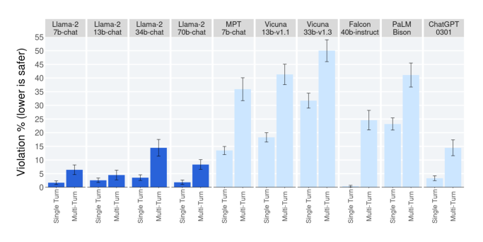 在图 18 中,我们分别报告了单轮和多轮对话的违规百分比。跨模型的一个趋势是多轮对话更容易诱导不安全响应。话虽如此,Llama 2-Chat 在与基线相比时仍然表现良好,特别是在多轮对话上。我们还观察到 Falcon 在单轮对话上表现